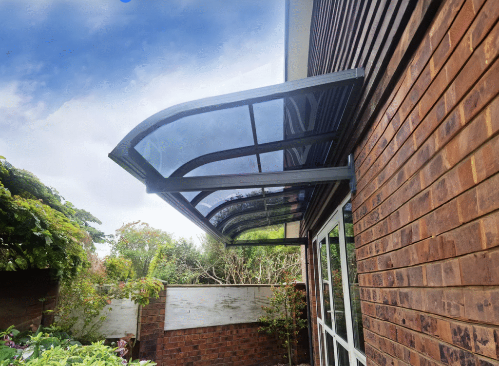 Curved Canopy is one of the most popular product in the market. The curved structure provides a multi functional role, as it provides an amazing finish for the product. The curved end blocks the water and sun rays coming through. It also provides a designer space to allow outdoor areas to be used all year around and can be customized according to the needs and design. Curved canopy is mounted against the wall of the property with a curved angle at the end, which is stylish and will let you use your outdoor space in various weather conditions. Frames are micro powder coated, and are available in different colours to match your property. Poly-carbonate sheet is used for roofing which is 2mm in thickness