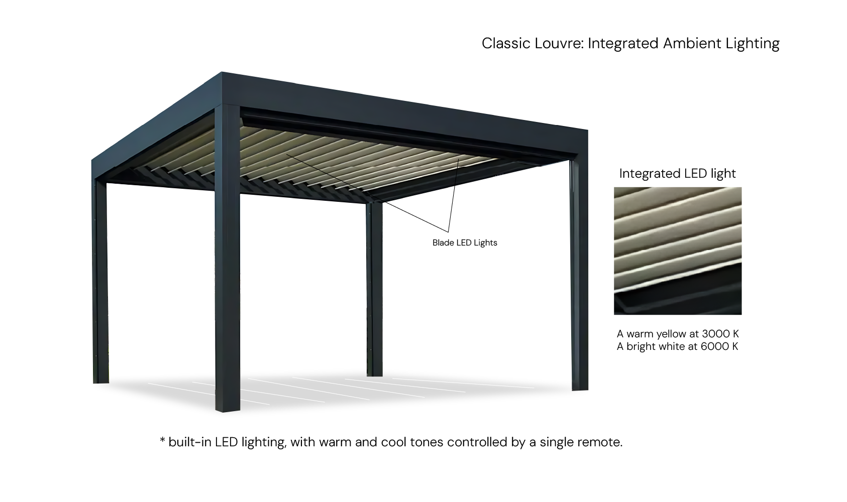 Stay outdoors into the evening with integrated LED lights built into the louvre blades. Choose from a warm, cozy glow or a clean, cool tone — both controllable with the same remote. No extra fittings, just seamless lighting where you need it.
