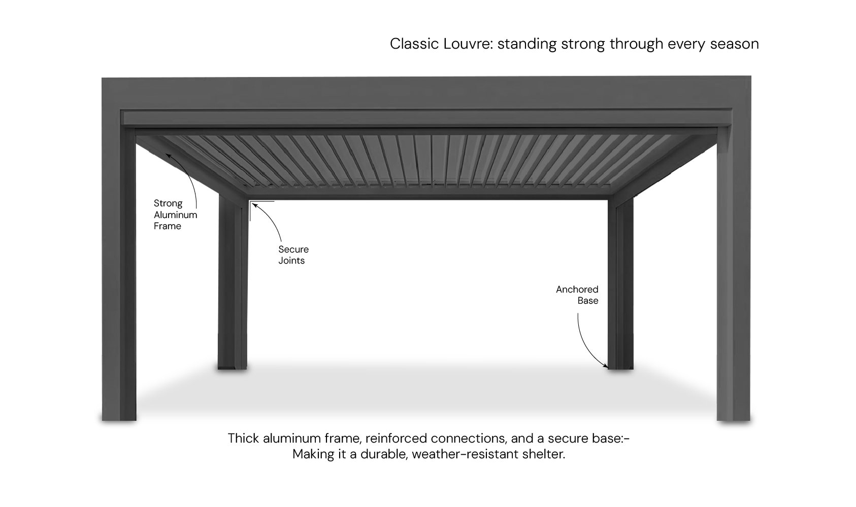 Classic louvre is built to handle all types of weather, all year round. Its strong frame is made from thick aluminum and has reinforced connections, so it stays firm against wind and light snow. A secure base anchors it to the ground, so you can feel confident it will hold up. It's a reliable and durable shelter that looks great and gives you peace of mind.
