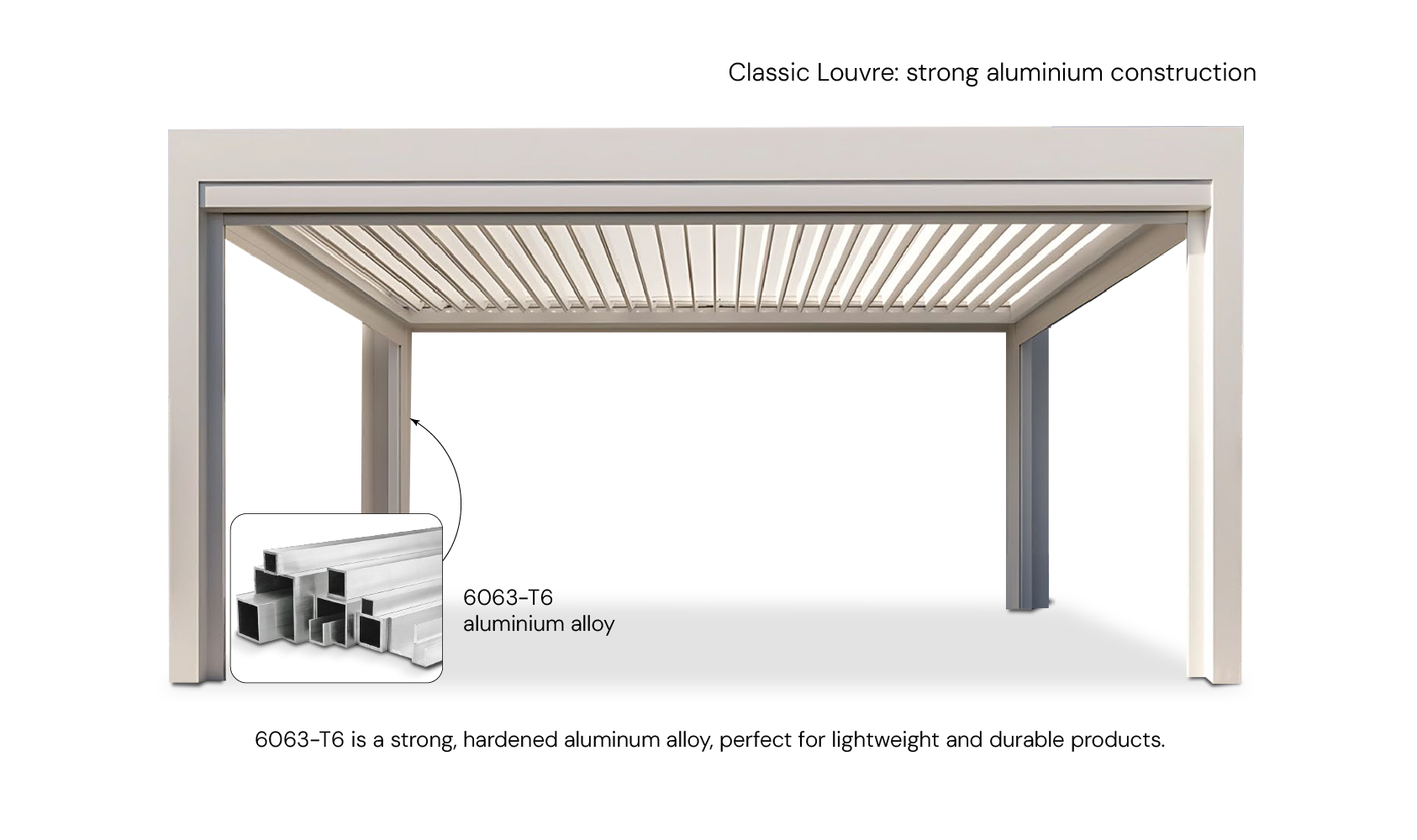 Crafted from high-grade 6063-T6 aluminium alloy, the Classic Louvre is built to handle New Zealand’s diverse weather — from strong winds to occasional snowfall. Its corrosion-resistant frame and precision-cut louvre blades ensure strength and long-term performance without warping or rusting. Whether in a sunny courtyard or coastal location, this system offers year-round protection with minimal upkeep.