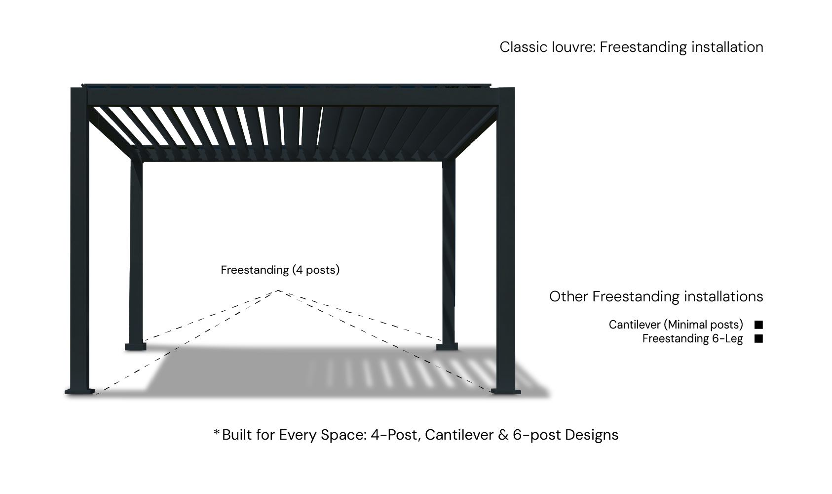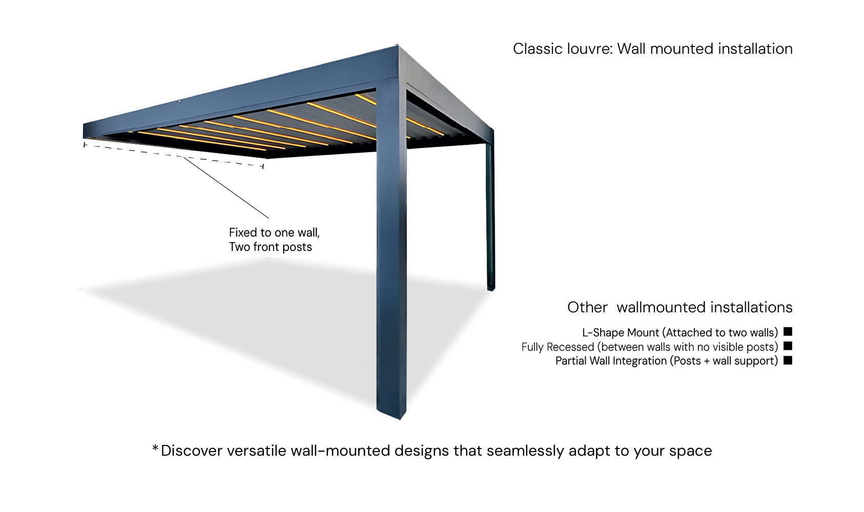 Classic Louvre can be installed as a freestanding unit—perfect for open areas like gardens, lawns, or poolside decks. With its robust post system and stylish roof structure, it defines a new space entirely on its own, giving you flexible placement and complete independence from building walls.